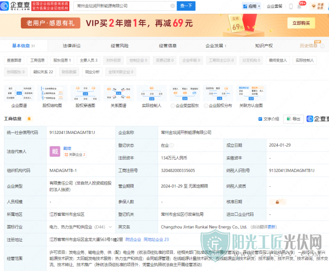 企查查顯示,1月29日,常州金壇潤(rùn)開(kāi)新能源有限公司成立,法定代表人為戴維,注冊(cè)資本134萬(wàn)人民幣,經(jīng)營(yíng)范圍含新興能源技術(shù)研發(fā)、太陽(yáng)能發(fā)電技術(shù)服務(wù)、熱力生產(chǎn)和供應(yīng)、合同能源管理、在線能源監(jiān)測(cè)技術(shù)研發(fā)等。股權(quán)全景穿透圖顯示,該公司由時(shí)代綠色能源有限公司全資持股,后者為寧德時(shí)代全資子公司。
